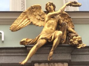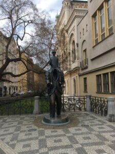Socha zde nestojí náhodou. Je to místo, kde se střetávají dva světy. Vpravo je židovská synagoga a vlevo křesťanský chrám. Navíc tudy vedla hranice mezi Starým městem a Josefovem.