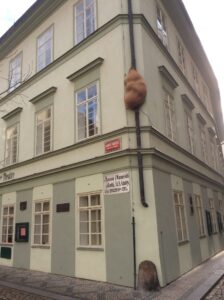 Autorem výtvarného díla je David Černý. Mnoho jeho děl, která najdete po Praze vyvolává bouřlivé diskuse. Mimina na Žižkovském vysílači, Kůň se svatým Václavem zavěšený hlavou dolů v Lucerně, Dva muži čůrající do mapy české republiky atp. Tady se však žádný velký poprask nekonal. To se nelíbilo ředitelce Divadla na Zábradlí, která tehdy nechala rozhlásit, že někteří herci se sochou nesouhlasí, že proti ní protestují, výtvarník napsal omluvný dopis a už toho byly plné noviny. Ve skutečnosti však nikdo neprotestoval a nebylo tak zač se omlouvat.